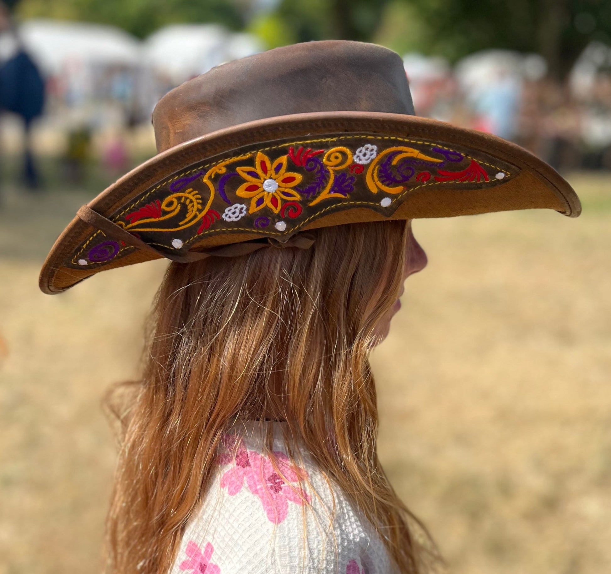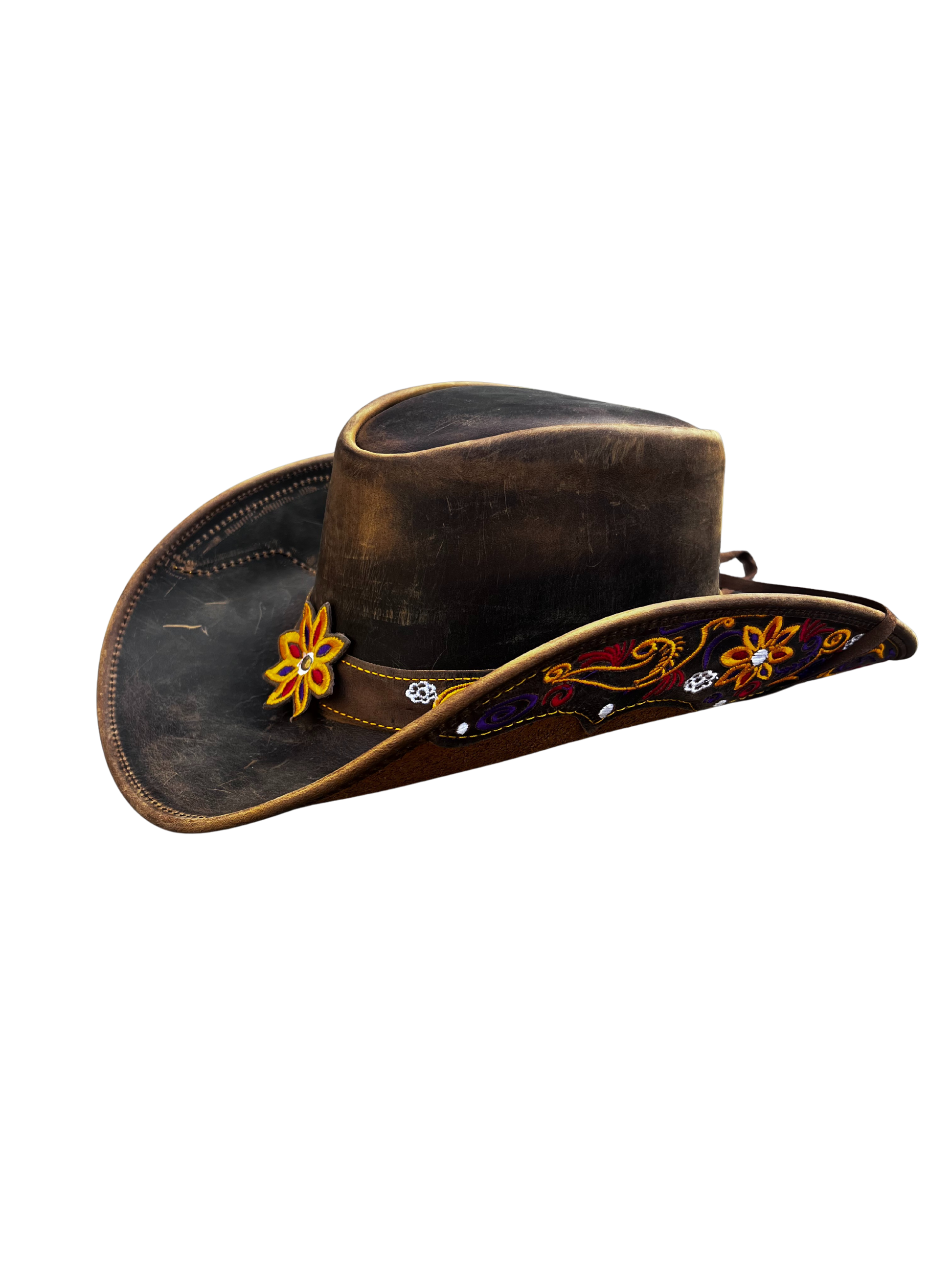 „Florentina Fire“ – Cowboyhut aus Crazy Horse Leder mit Stickerei in warmen Tönen