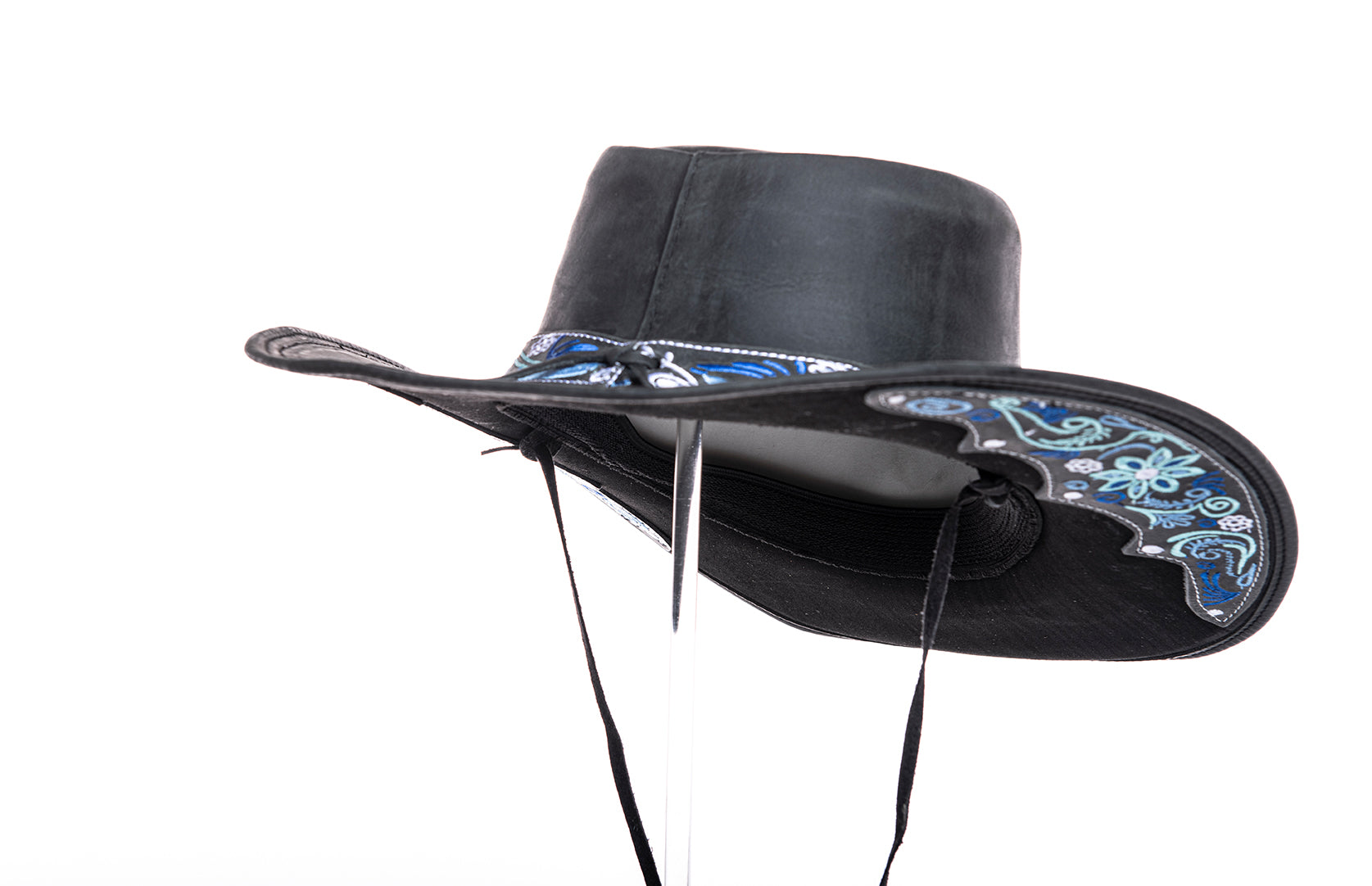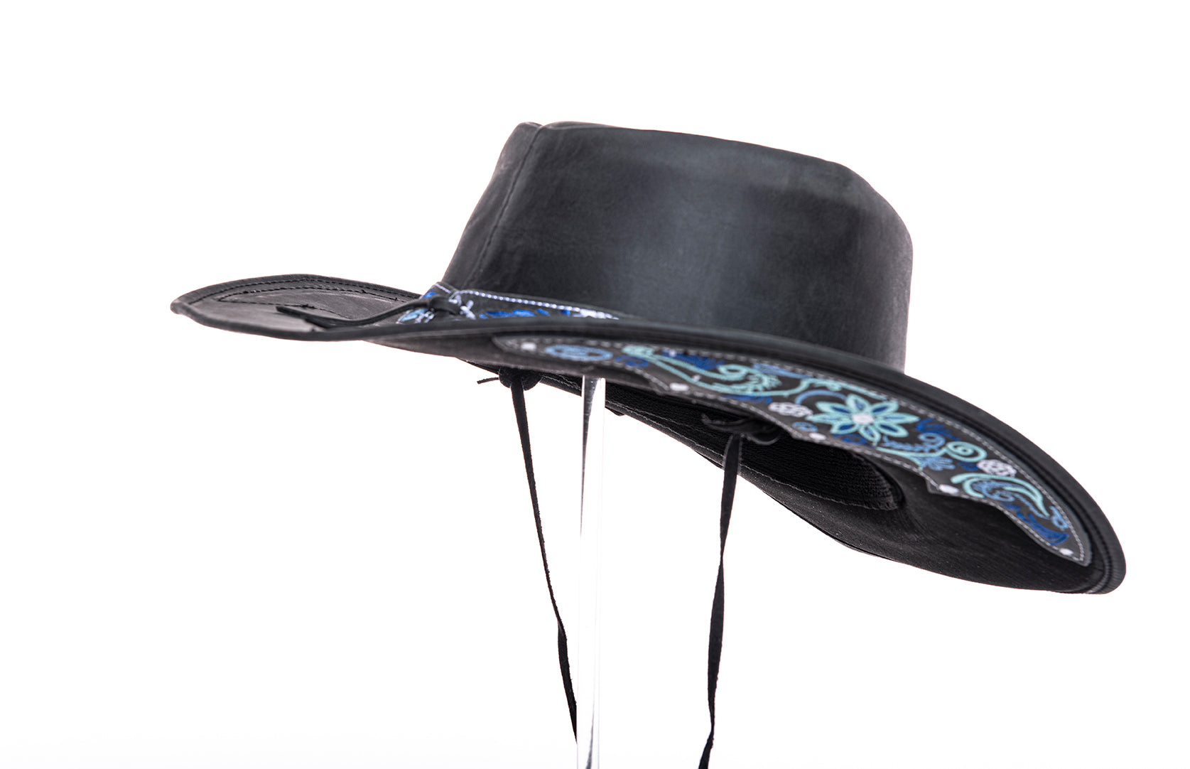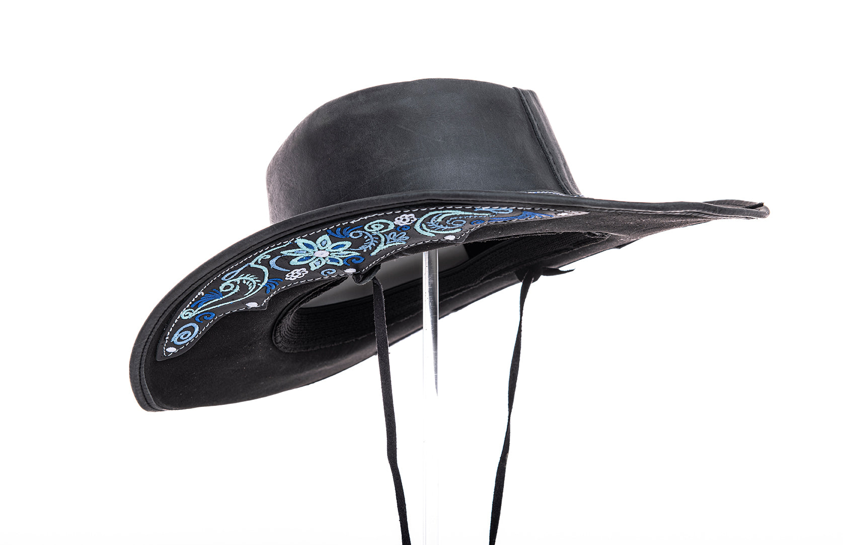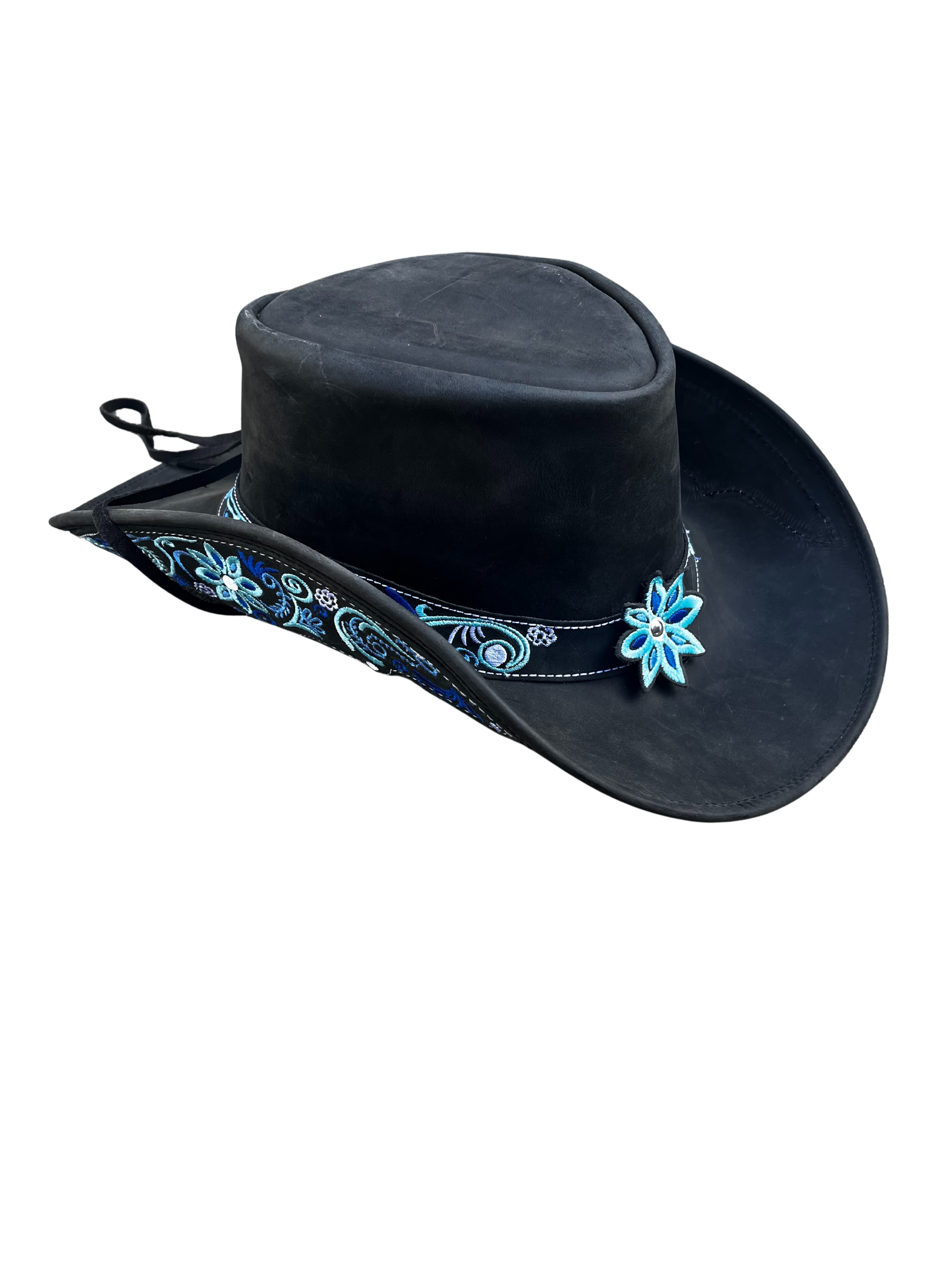 „Florentina Ice“ – Cowboyhut aus schwarzem Leder mit blauer Stickerei