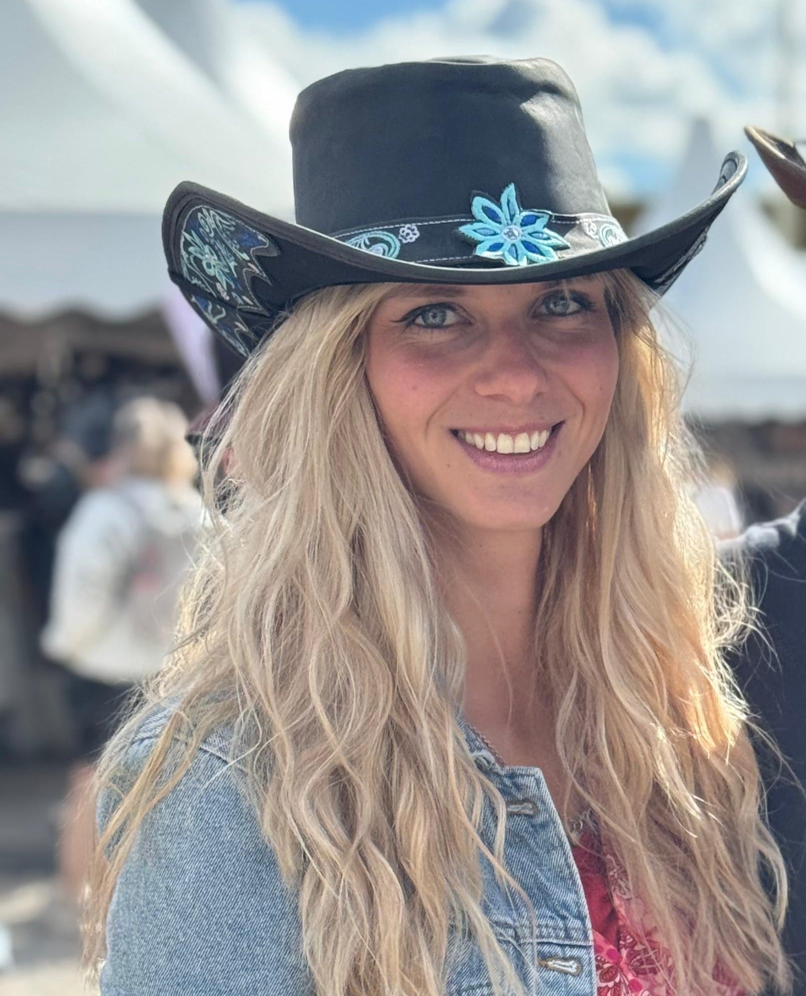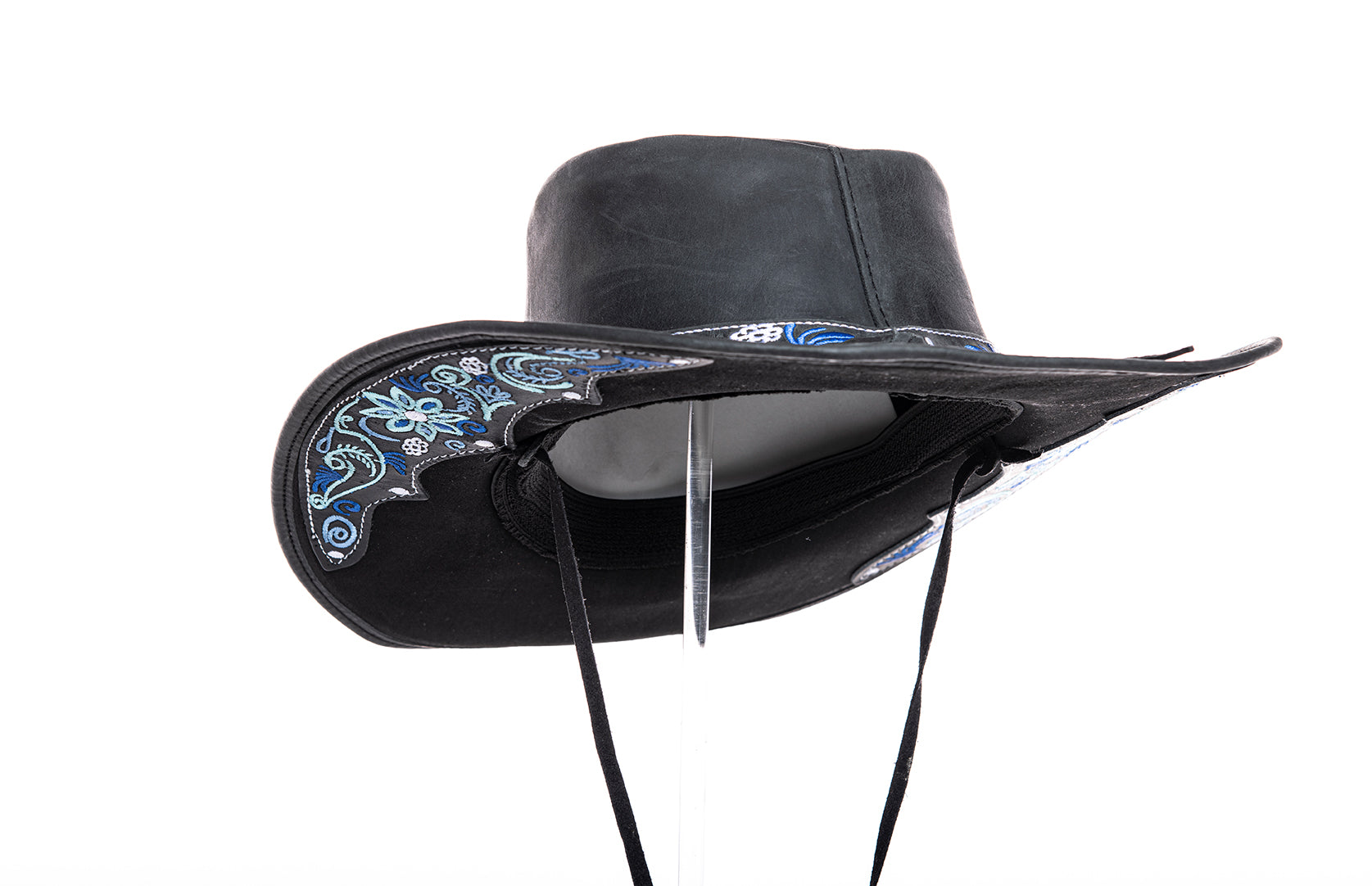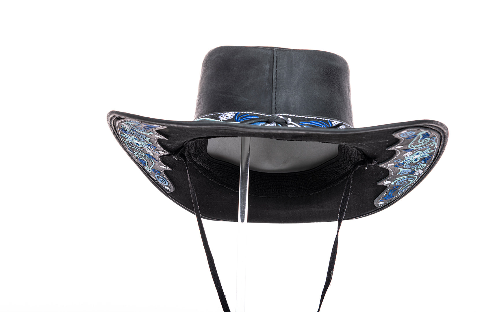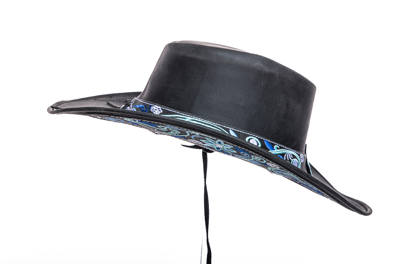 „Florentina Ice“ – Cowboyhut aus schwarzem Leder mit blauer Stickerei